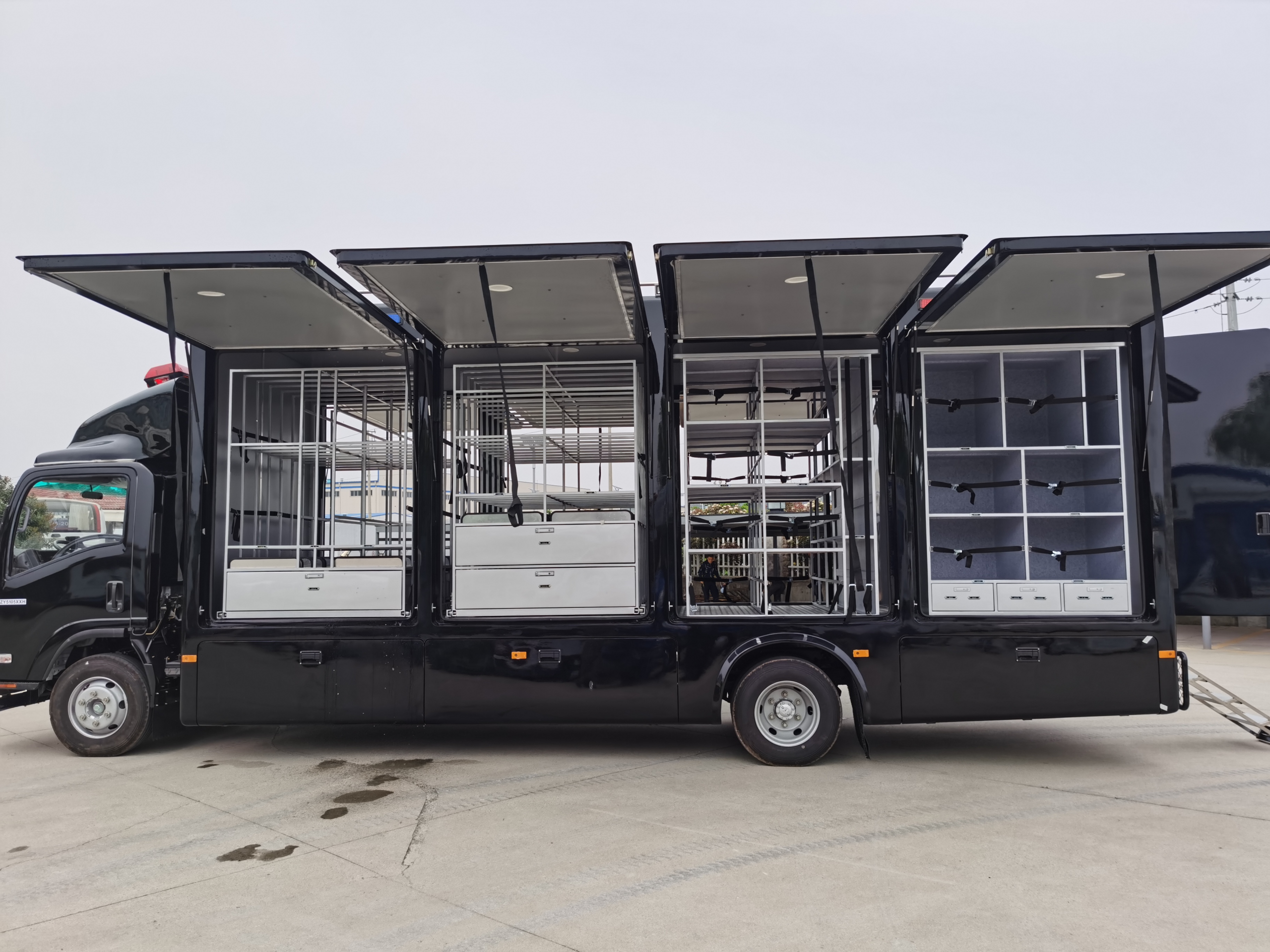 The interior can be customized with shelves and storage cabinets to categorically store equipment such as riot shields, batons, first aid kits, and drones.